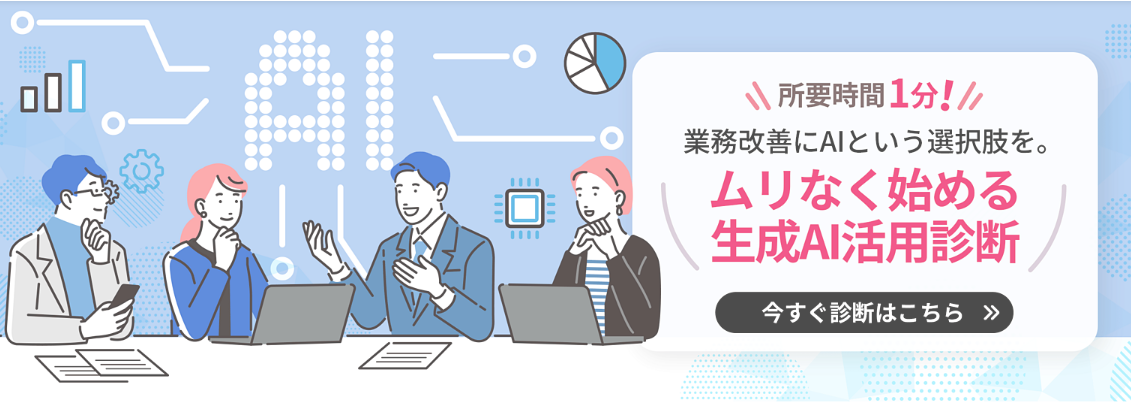 NTTドコモビジネスが提供する法人向けの診断コンテンツで、約3分間の質問に答えるだけで、自社の「AI活用レベル」を測定し、課題解決に向けた「最適なAI活用法」や「導入のヒント」を知ることができるものとなっています。