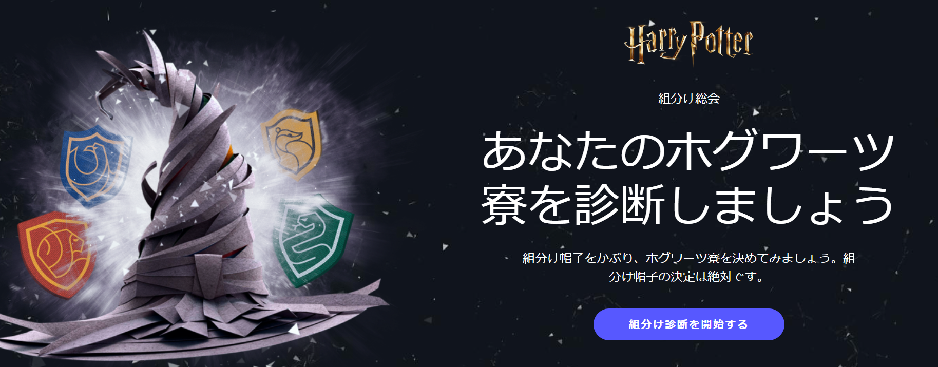 この公式サイトでは、映画『ハリー・ポッター』同様に「組分け帽子」からの不思議な質問に答えていくことで、自分の性格に最も適した寮を厳格に診断してくれます。