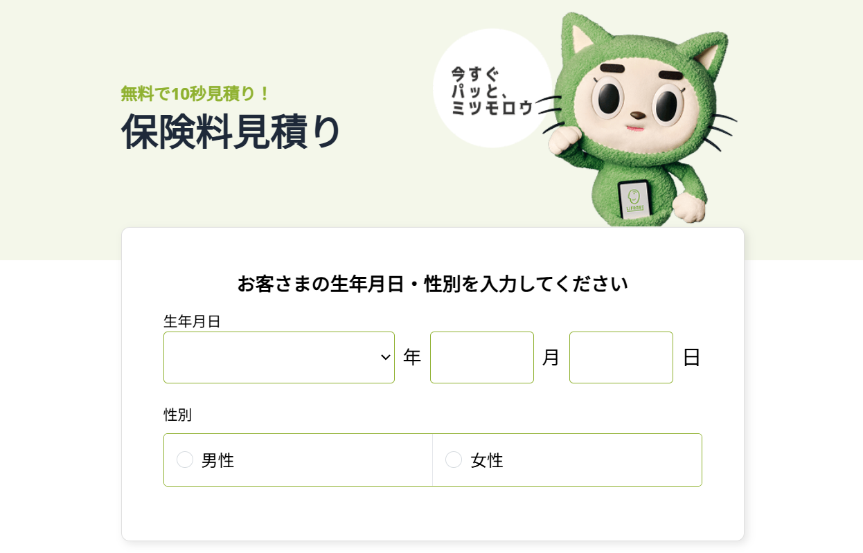 - 特徴: 性別と年齢を入れるだけで月々の保険料を即座に提示。UXのシンプルさが成約率に直結しています。