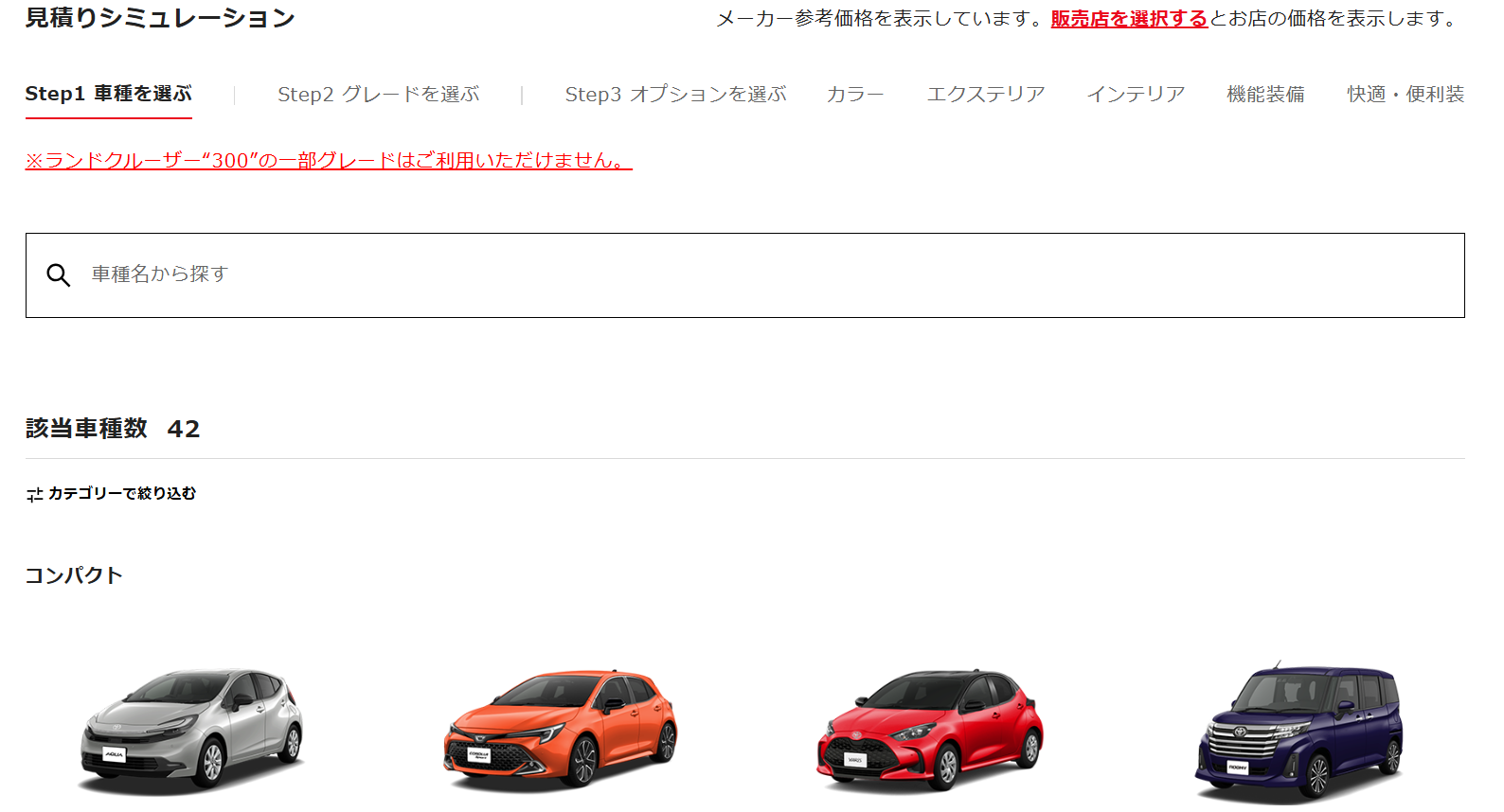- 特徴: 車種、グレード、オプションを選択し、支払い総額を算出。非常に高機能なコンフィギュレーターの代表例です。