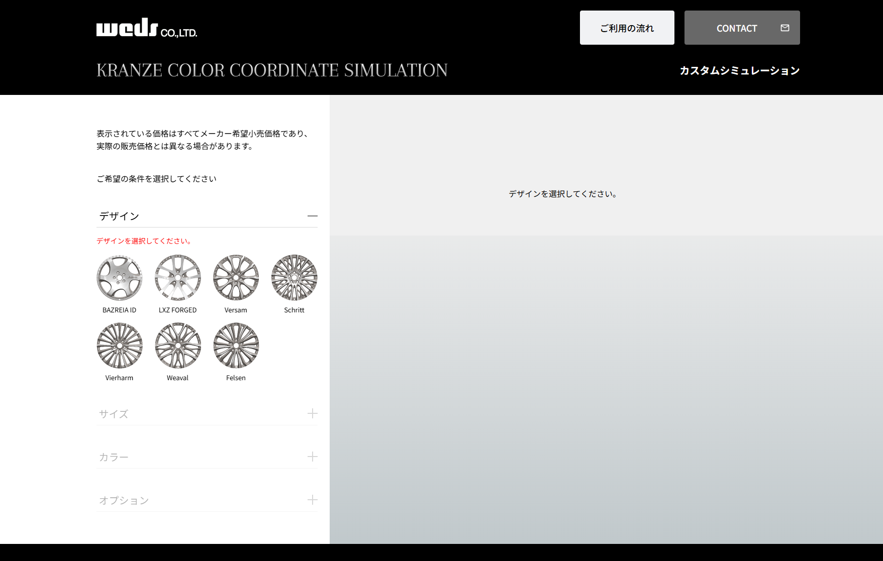 - 特徴: ユーザーが車種やホイールデザインを選択すると、リアルタイムでカラーコーディネートと見積価格を確認できます。ホイールのカラーコーディネートの バリエーションまで確認できる、こだわり抜かれたシミュレーションです。